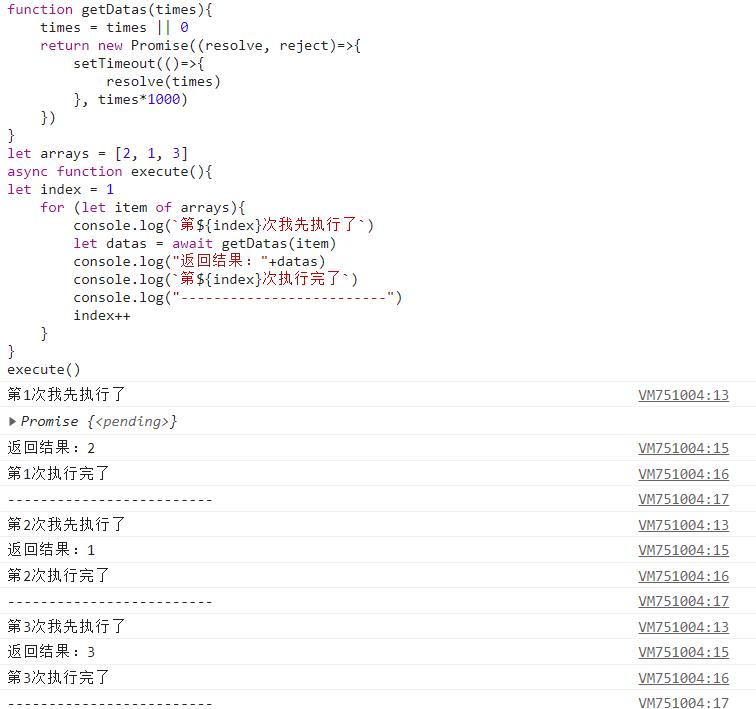 - for await of:也要用在async异步方法里,有break,但是它一般是使用在item是个异步方法的情况下,并不常见,场景如下面对应的例子,要遍历的数组元素是个异步请求,异步没回来之前整个for循环代码不执行: